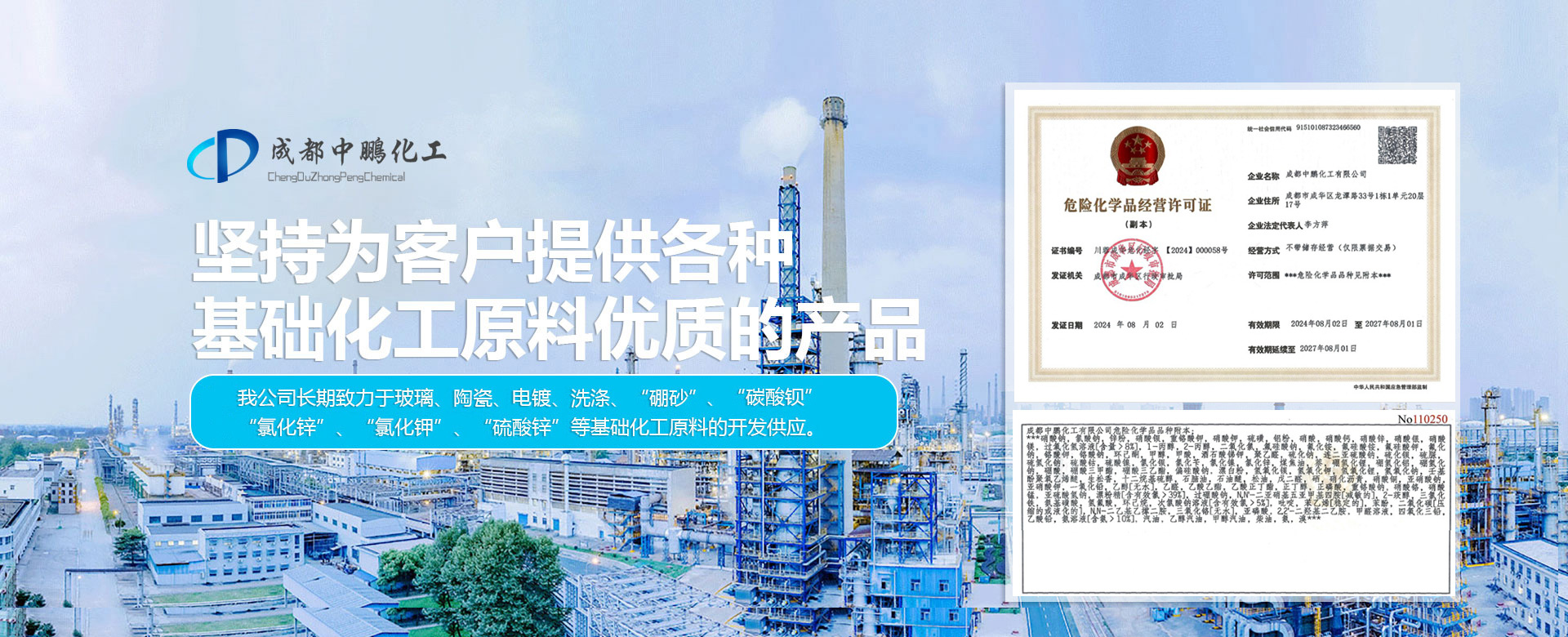 成都中鵬化工有限公司成立于2001年,位于成都市新都區木蘭木名商塑化城2棟11號,公司成立16年以來,一直堅持為客戶提供各種基礎化工原料的產品。我公司長期對于玻璃、陶瓷、電鍍、洗滌、“硼砂”、“碳酸鋇”、“氯化鋅”、“氯化鉀”、“硫酸鋅”等基礎化工原料的開發供應。 公司現在員工上百人,在全國擁有多個營銷體系和完善的售后服務體系,長期以來,通過為客戶提供各種基礎化工原料的產品,形成了良好的合作關系...